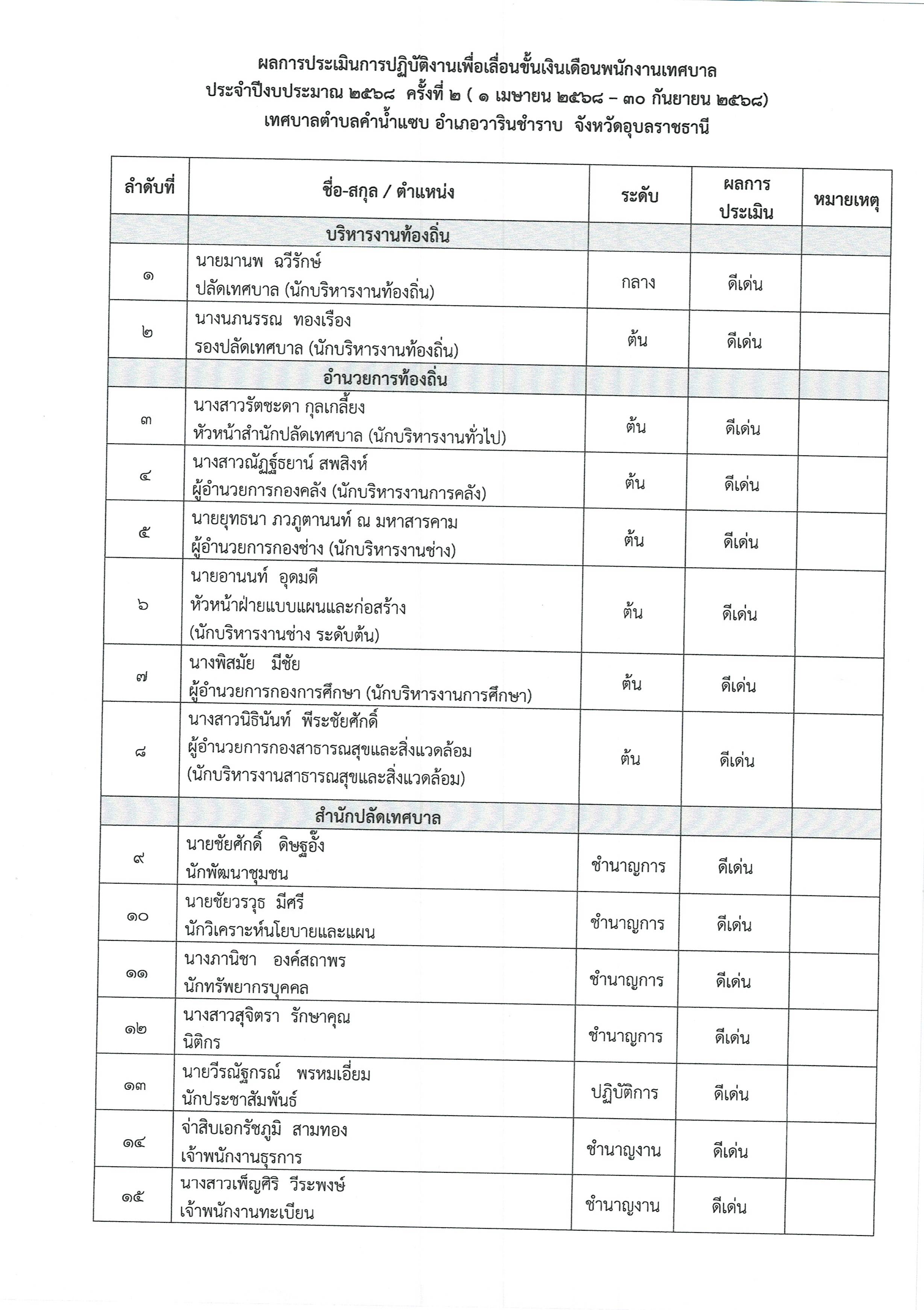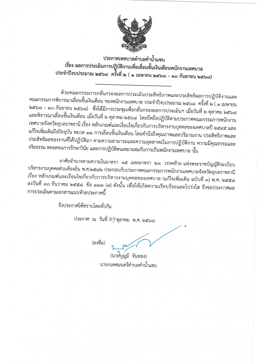 ผลการประเมินผลการปฏิบัติงานเพื่อเลื่อนขั้นเงินเดือนพนักงานเทศบาลตำบลคำน้ำแซบ และลูกจ้างประจำ ประจำปีงบประมาณ 2568 ครั้งที่ 2 (1 เม.ย.-30 ก.ย.68)