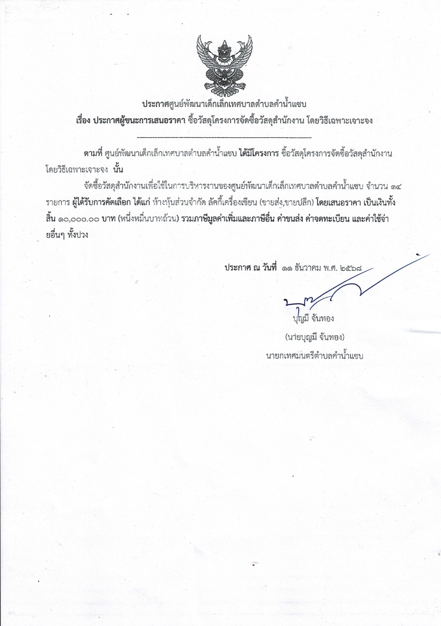 ประกาศผู้ชนะการเสนอราคา ซื้อวัสดุสำนักงาน โดยวิธีเฉพาะเจาะจง