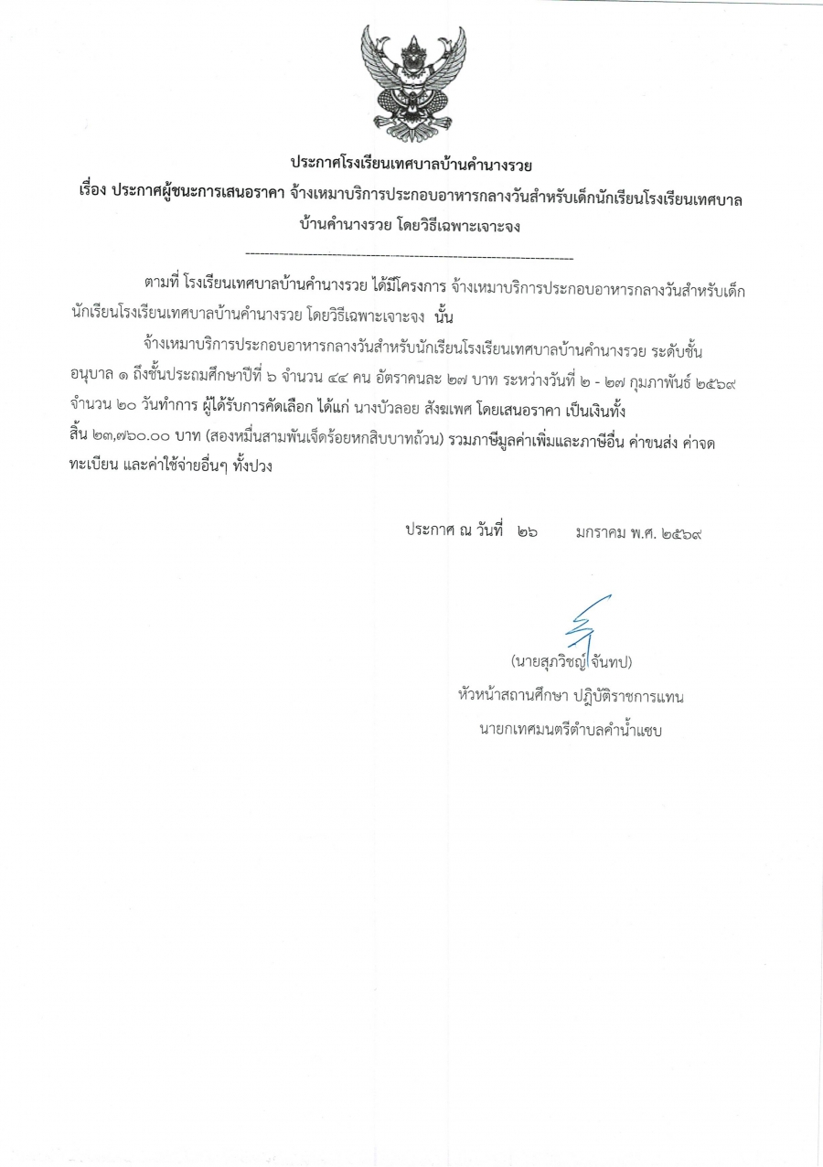 ประกาศผู้ชนะการเสนอราคา จ้างเหมาบริการประกอบอาหารกลางวันสำหรับเด็กนักเรียนโรงเรียนเทศบาลบ้านคำนางรวย โดยวิธีเฉพาะเจาะจง
