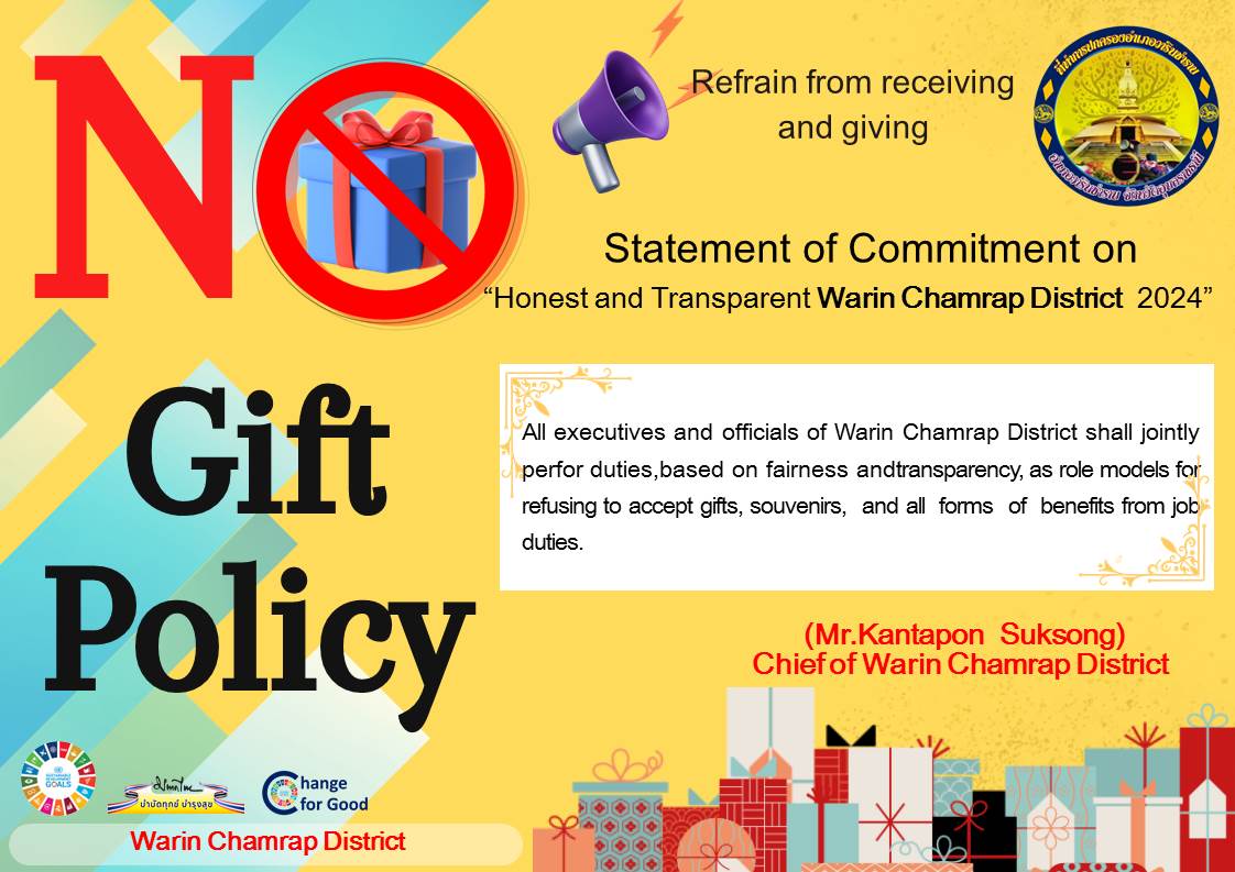 อำเภอวารินชำราบ ประกาศเจตนารมย์ "สุจริต โปร่งใส อำเภอวารินชำราบ ใสสะอาด" และ"งดรับ งดให้"ของขวัญ ของกำนัลทุกชนิดจากการปฏิบัติหน้าที่ (NO Gift Policy) ปีงบประมาณ 2567