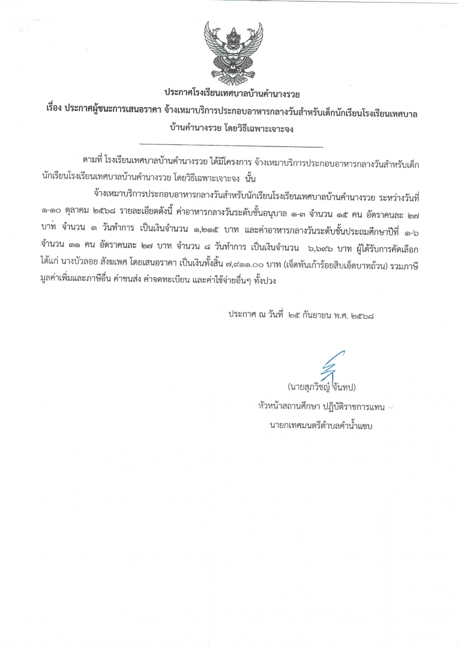 ประกาศผู้ชนะการเสนอราคา จ้างเหมาบริการประกอบอาหารกลางวันสำหรับเด็กนักเรียนโรงเรียนเทศบาลบ้านคำนางรวย โดยวิธีเฉพาะเจาะจง