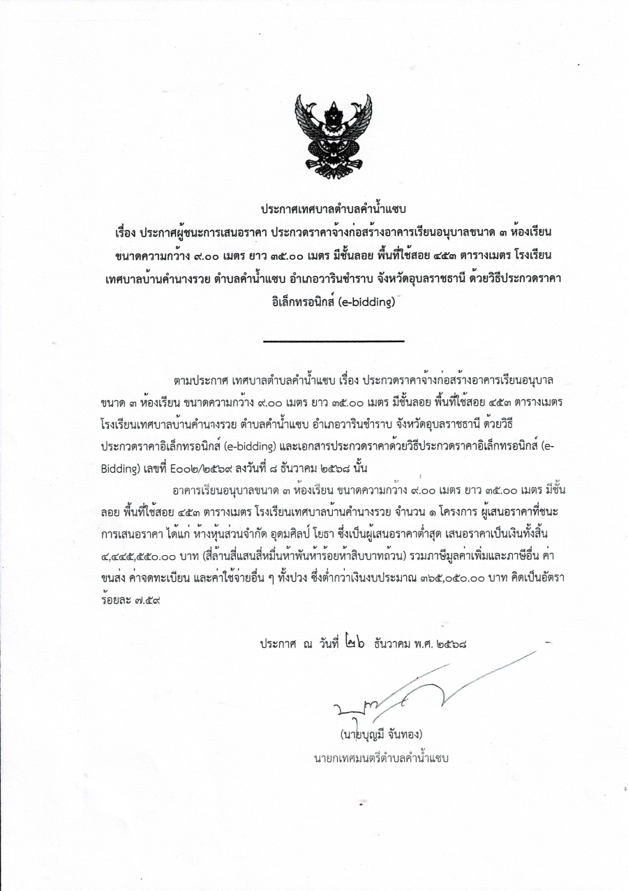 ประกาศผู้ชนะการเสนอราคา ประกวดราคาจ้างก่อสรา้งอาคารเรียนอนุบาลขนาด 3 ห้องเรียน ขนาดความกว้าง 9 เมตร ยาว 35 เมตร มีขั้นลอย พื้นที่ใช้สอย 453 ตรม.โรงเรียนเทศบาลบ้านคำนางรวย ต.คำน้ำแซบ อ.วาริน จ.อุบล ด้วยวิธีประกวดราคาอิเล็กทรอนิกส์ (e-bidding)