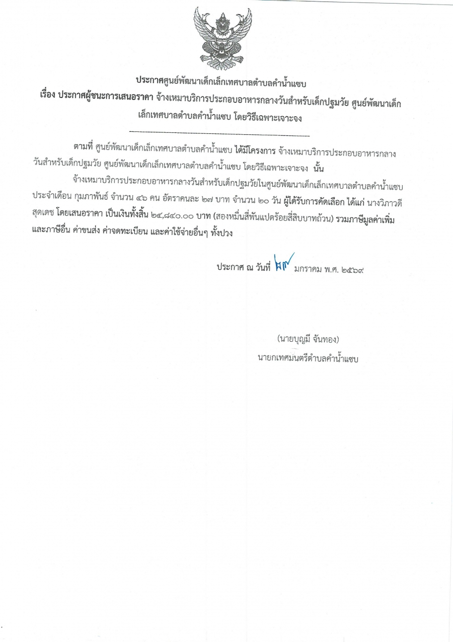 ประกาศผู้ชนะการเสนอราคา จ้างเหมาบริการประกอบอาหารกลางวันสำหรับเด็กปฐมวัย ศูนย์พัฒนาเด็กเล็กตำบลคำน้ำแซบ โดยวิธีเฉพาะเจาะจง